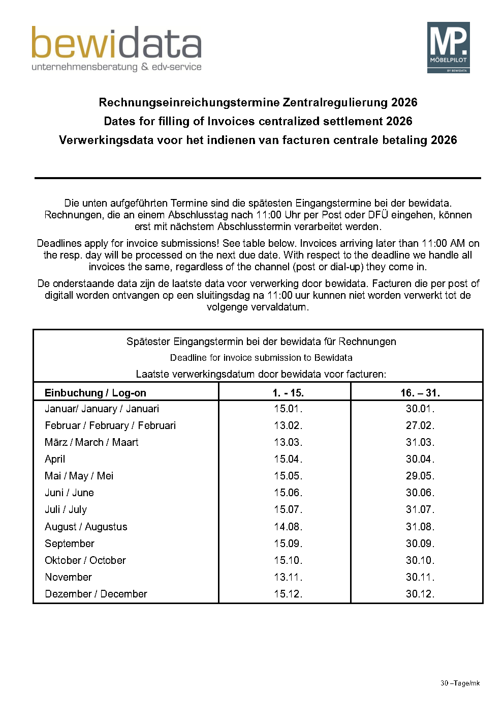 Deadlines apply for invoice submissions! See table below. Invoices arriving later than 11:00 AM on the respective day will be processed on the next due date. With respect to the deadline, we handle all invoices the same way, regardless of the channel (post or dial-up) they come in.